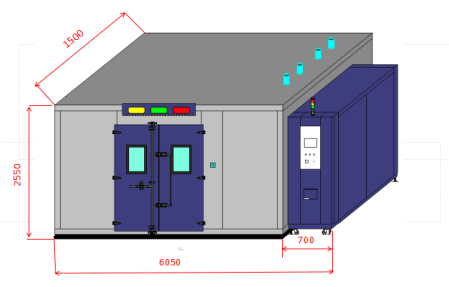 外形尺寸 | W 5550× H 2780×D 3200 mm,不包括电机、门把手、测试孔等突出部分 | ||