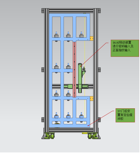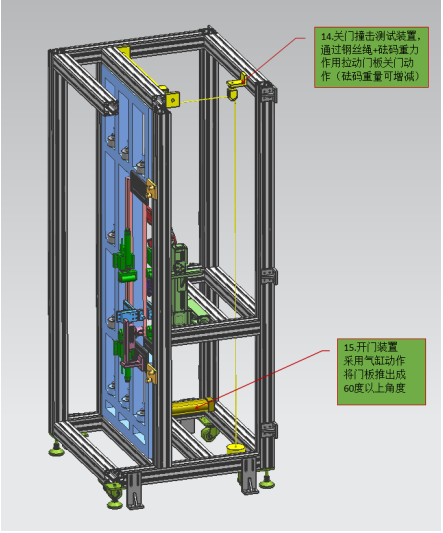 结构上采用加厚80*80钢材材焊接而成,框架稳固可靠,结构美观大体,配备脚轮脚杯,方便移动定位。考虑到门的撞击测试的振动性影响,将机台进行了分体设计,即工位之间的完全独立性,同时控制柜也分离设计,所以机台分为两个主机工位体和一个控制柜体,有效克服了工位之间的撞击振动的相互影响,以及振动对电子元器件的寿命损伤。采用合金钢门体,门体采用焊接设计,同时均匀化了增减砝码的重量;或采用真甲级防盗门体+门框设计,接近锁体的真实使用性。